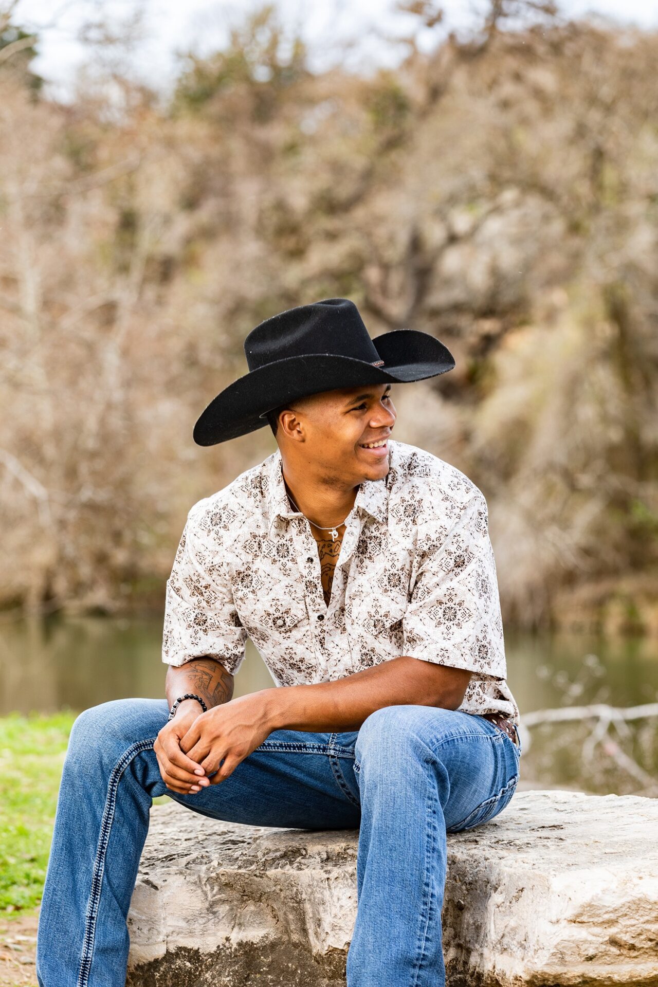young black man senior picture in texas with black cowboy hat