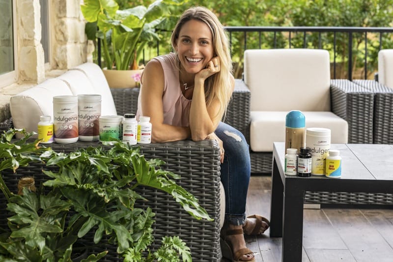 Blonde woman on patio selling supplements