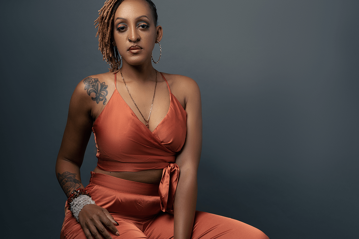 beautiful black woman with blonde dreadlocks in orange outfit